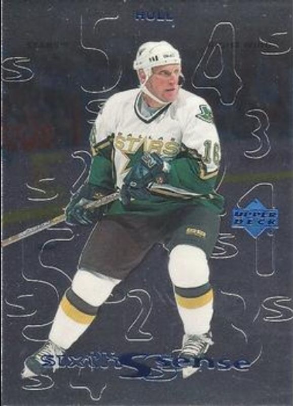 The Brett Hull 1999 Upper Deck #SS3 Sixth Sense card is 1 of 28 Brett Hull's card variations in the 1999 Upper Deck set being tracked by Sports Card Investor, including #43 Base, #144 Base, #43 UD Exclusives /100, #144 UD Exclusives /100, and #144 UD Exclusives 1/1 /1.