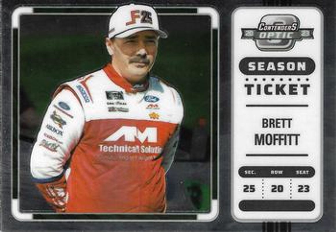 The Brett Moffitt 2023 Chronicles NASCAR #12 Contenders Optic card is 1 of 52 Brett Moffitt's card variations in the 2023 Chronicles NASCAR set being tracked by Sports Card Investor, including Base, Blue /199, Red /99, Purple /25, and Gold /10.
