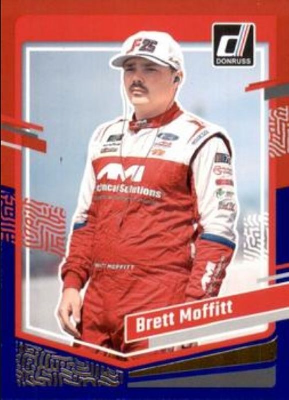 The Brett Moffitt 2024 Donruss NASCAR #50 Red & Blue card is 1 of 33 Brett Moffitt's card variations in the 2024 Donruss NASCAR set being tracked by Sports Card Investor, including Base, Optic, Optic Black Pandora, Optic Blue Velocity, and Optic Holo.