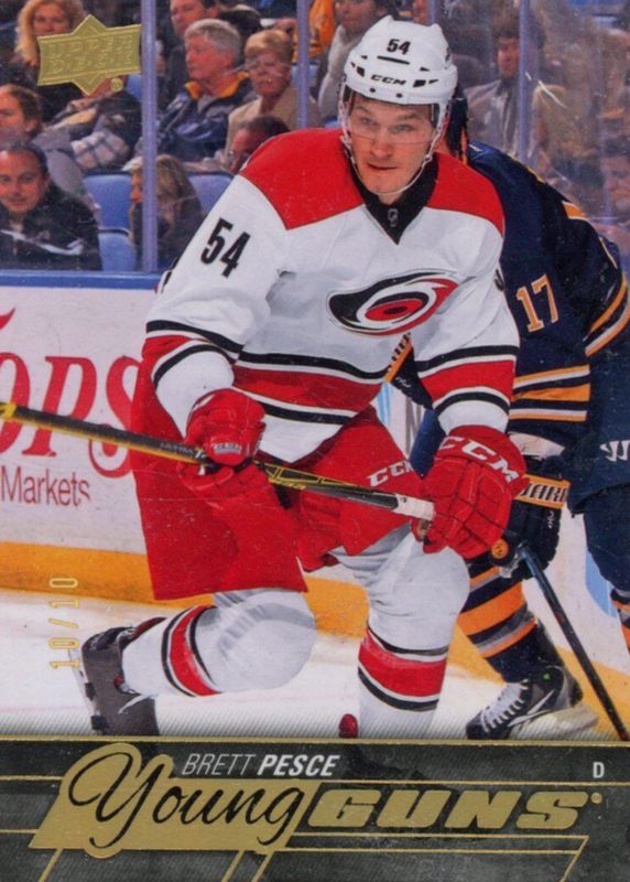 The Brett Pesce 2015 Upper Deck #487 Young Guns - UD High Gloss /10 Rookie card in Raw condition has not changed in price in the last 30 days and was last sold for $44.36 .