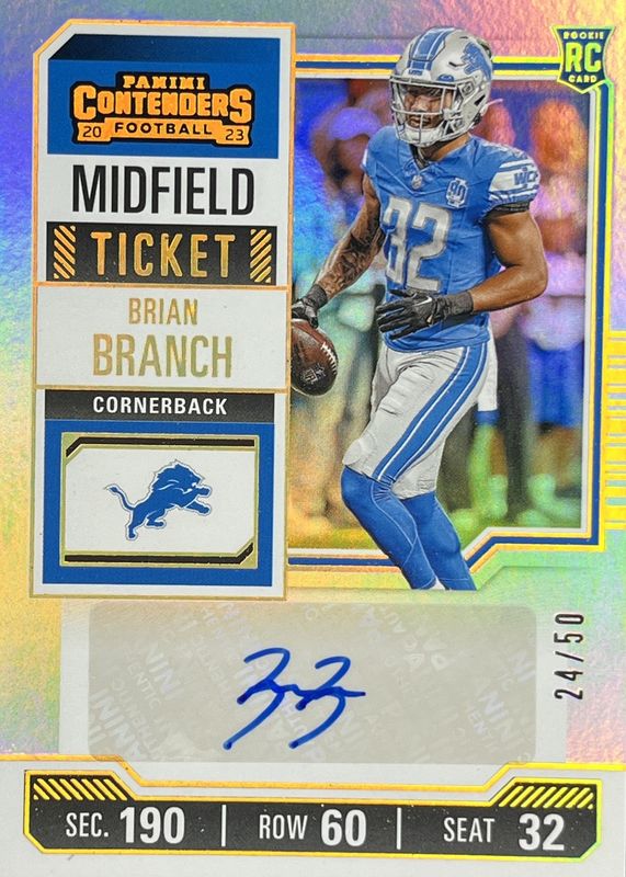 2023 Panini Contenders Brian Branch Midfield Ticket Ticket Auto /50 Lions