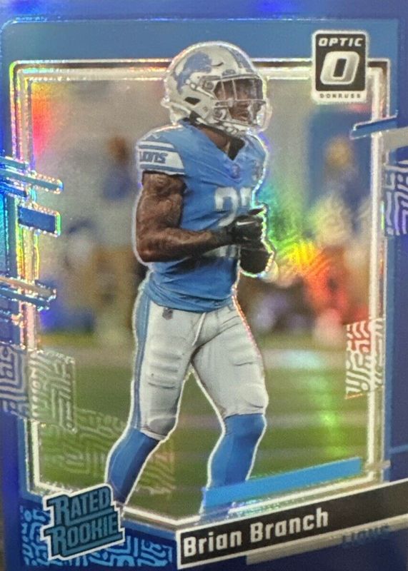 The Brian Branch 2023 Optic #233 Blue /199 Rookie card in Raw condition has not changed in price in the last 30 days and was last sold for $7.57 .
