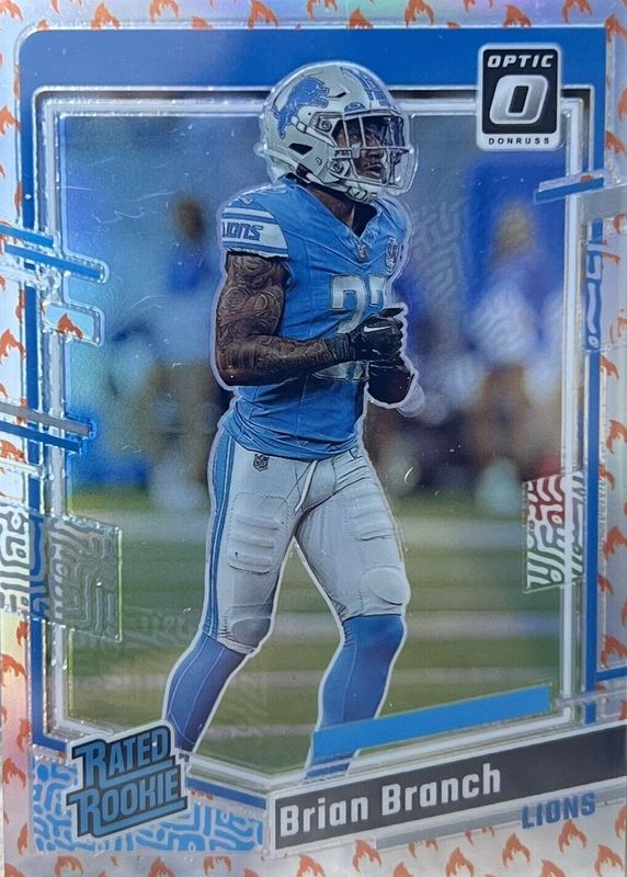 The Brian Branch 2023 Optic #233 Fire /(SSP) Rookie card in Raw condition has not changed in price in the last 30 days and was last sold for $7.52 .