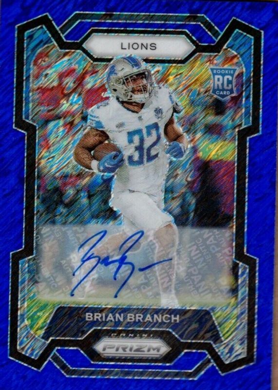The Brian Branch 2023 Prizm #328 Rookie Autographs - Blue Shimmer /25 card in Raw condition has not changed in price in the last 30 days and was last sold for $184.90 .