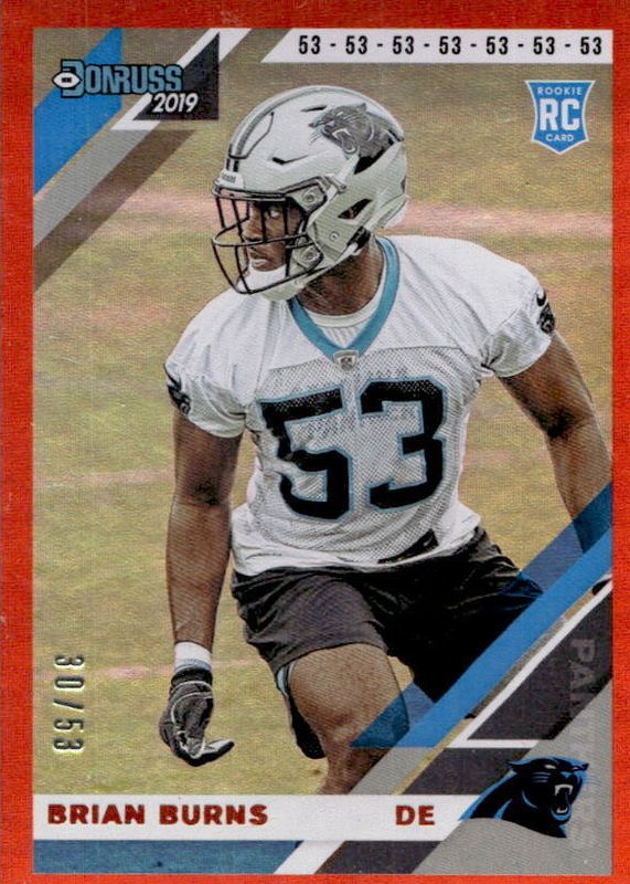 The Brian Burns 2019 Donruss #256 Jersey Number (/53) Rookie card in Raw condition has not changed in price in the last 30 days and was last sold for $9.99 .