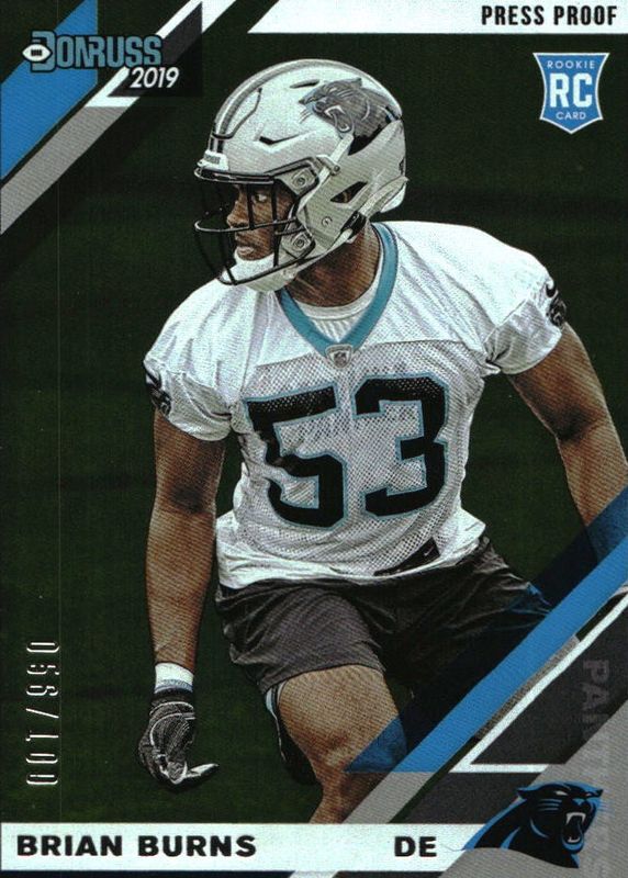 This card is 1 of 15 Brian Burns' card variations in the 2019 Donruss set being tracked by Sports Card Investor, including Base, Aqueous Test, Jersey Number (/53), Press Proof Blue, and Press Proof Bronze.