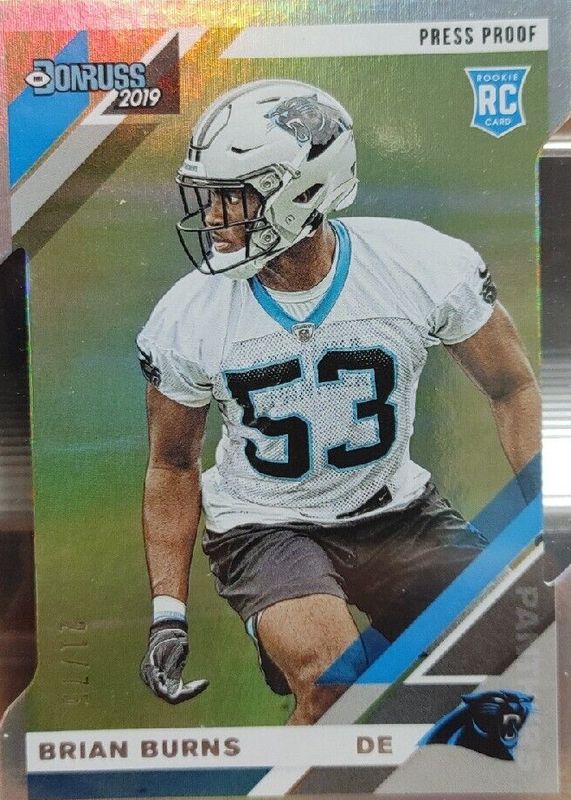 This card is 1 of 15 Brian Burns' card variations in the 2019 Donruss set being tracked by Sports Card Investor, including Base, Aqueous Test, Jersey Number (/53), Press Proof Blue, and Press Proof Bronze.