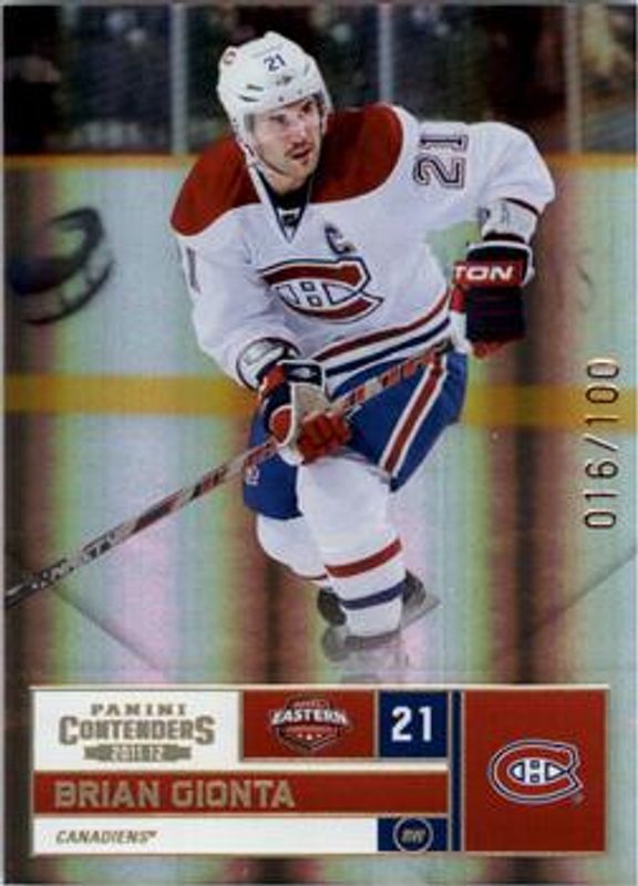 The Brian Gionta 2011 Contenders #75 Gold /100 card is 1 of 7 Brian Gionta's card variations in the 2011 Contenders set being tracked by Sports Card Investor, including Base /800, Black /1, Printing Plate Black /1, Printing Plate Cyan /1, and Printing Plate Magenta /1.
