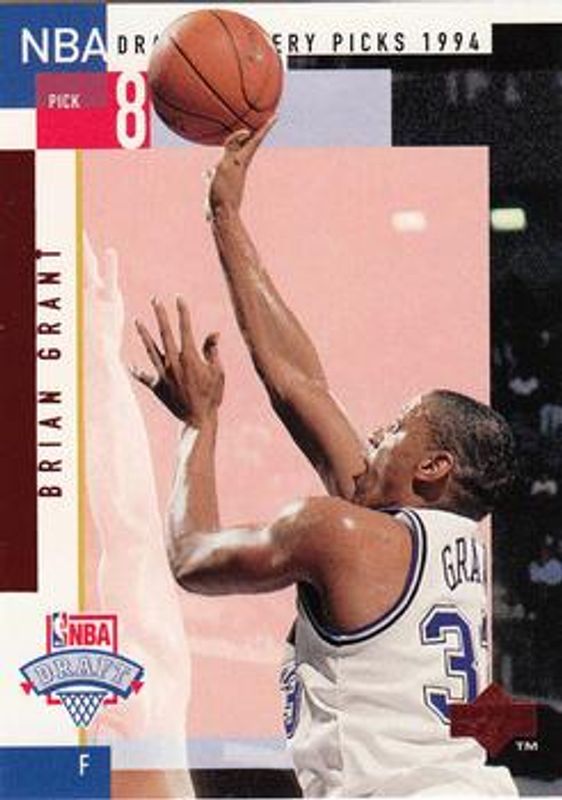 The Brian Grant 1994 Upper Deck #D8 NBA Draft Lottery Picks 1994 Rookie card is 1 of 7 Brian Grant's card variations in the 1994 Upper Deck set being tracked by Sports Card Investor, including #181 Base, #254 Base, #RS8 Rookie Standouts, #SE165 Special Edition, and #SE165 Special Edition Gold.