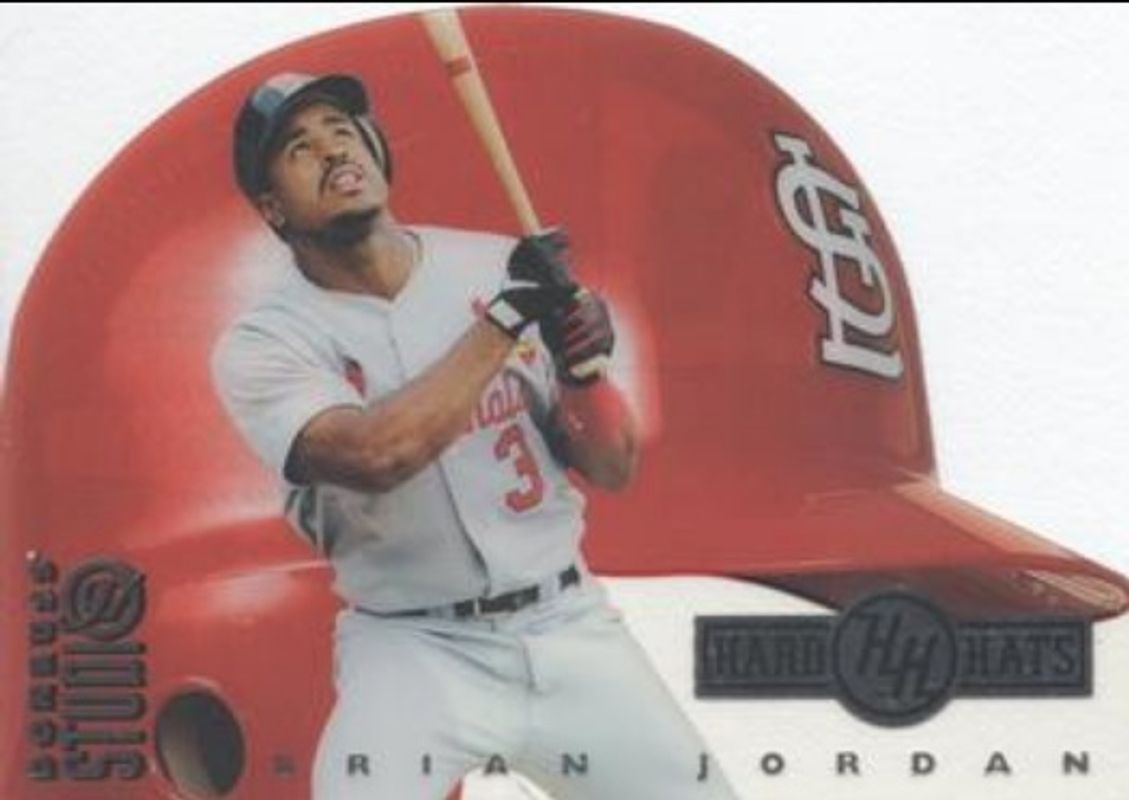 The Brian Jordan 1997 Donruss Studio #24 Hard Hats /5000 card is 1 of 4 Brian Jordan's card variations in the 1997 Donruss Studio set being tracked by Sports Card Investor, including Base, Press Proof Gold, and Press Proof Silver.