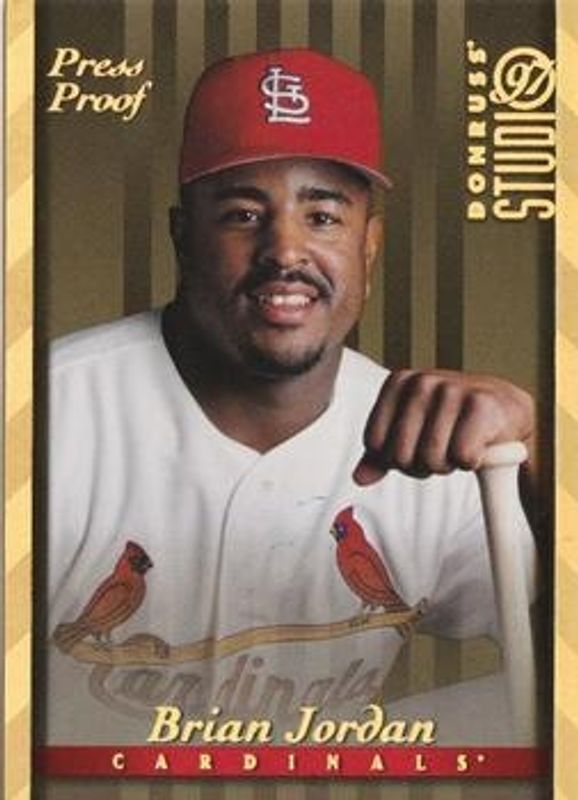 The Brian Jordan 1997 Donruss Studio #140 Press Proof Gold card is 1 of 4 Brian Jordan's card variations in the 1997 Donruss Studio set being tracked by Sports Card Investor, including Base, Press Proof Silver, and Hard Hats /5000.