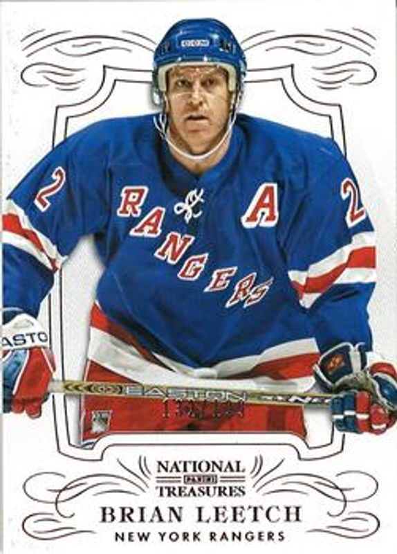 The Brian Leetch 2013 National Treasures #95 Base /99 card is 1 of 31 Brian Leetch's card variations in the 2013 National Treasures set being tracked by Sports Card Investor, including Gold /25, Silver /25, Emerald /5, Black /1, and Printing Plates Black /1.
