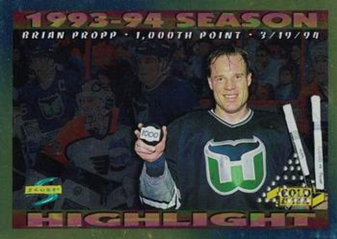 The Brian Propp 1994 Score #247 Gold Line - Punched card is 1 of 4 Brian Propp's card variations in the 1994 Score set being tracked by Sports Card Investor, including Base, Gold Line, and Platinum.