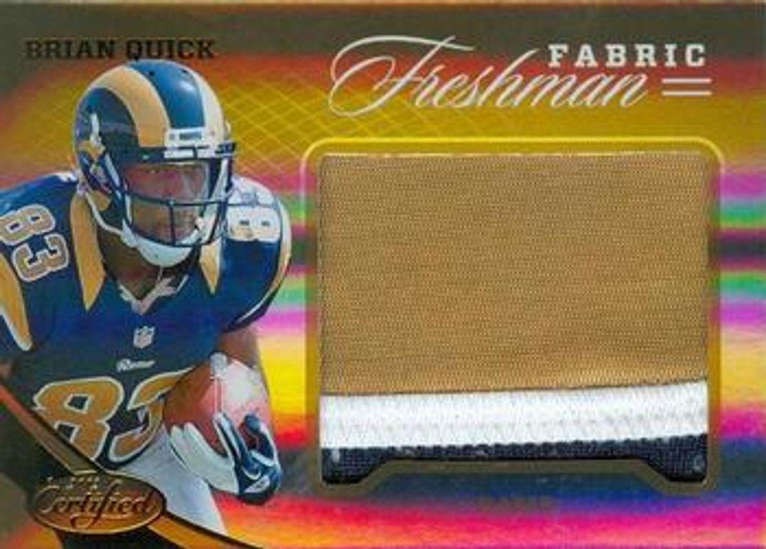 The Brian Quick 2012 Certified #329 Mirror Gold Materials /25 Rookie card is 1 of 22 Brian Quick's card variations in the 2012 Certified set being tracked by Sports Card Investor, including Base /999, Mirror Blue /100, Mirror Gold /25, Mirror Emerald /5, and Mirror Black /1.