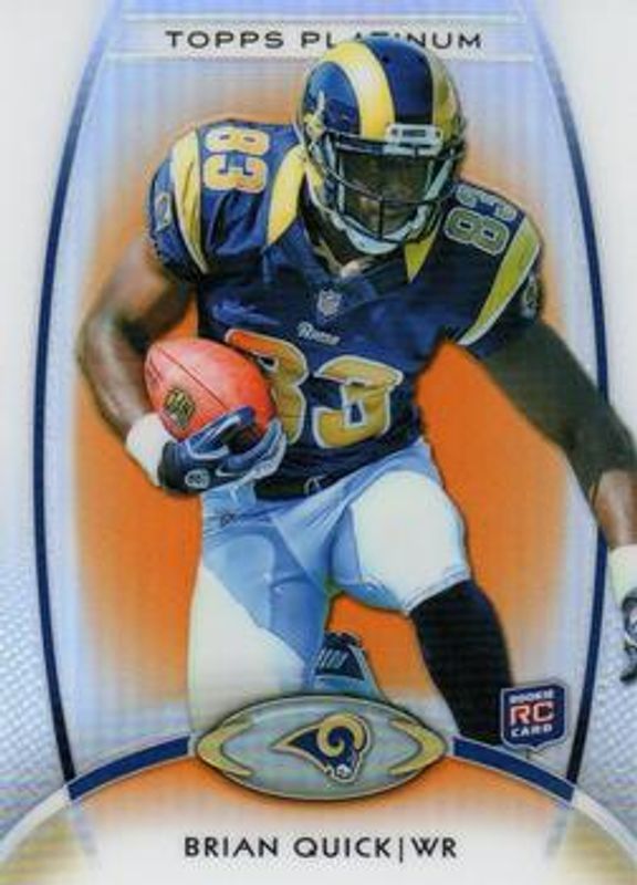 The Brian Quick 2012 Topps Platinum #125 Orange Refractor Rookie card is 1 of 33 Brian Quick's card variations in the 2012 Topps Platinum set being tracked by Sports Card Investor, including Base, Black Refractor, X-Fractor, Blue Refractor /99, and Purple Refractor /75.