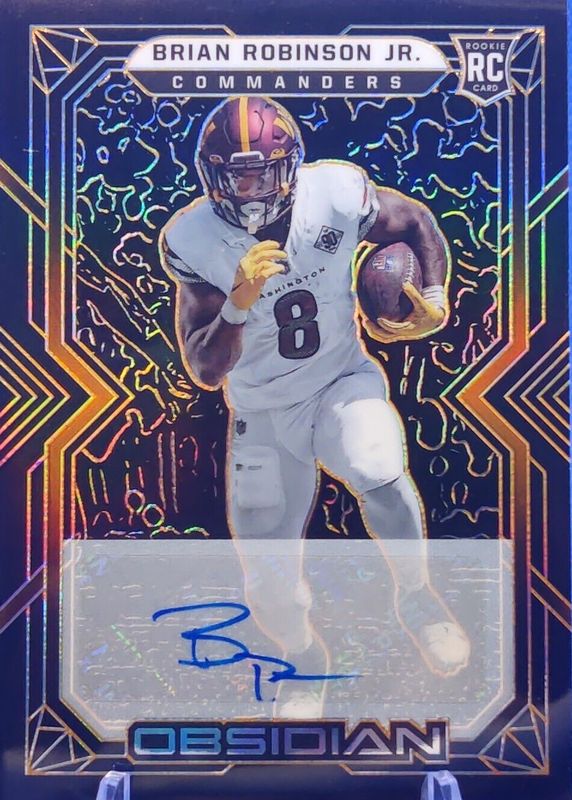 This card is 1 of 7 Brian Robinson Jr.'s card variations in the 2022 Obsidian set being tracked by Sports Card Investor, including Rookie Autographs (/199), Rookie Autographs - Electric Etch Green /50, Rookie Autographs - Electric Etch Yellow /25, Rookie Autographs - Electric Etch Red /10, and Rookie Autographs - Electric Etch Red Flood /6.