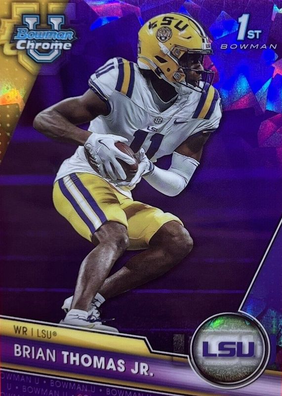 The Brian Thomas Jr. 2023 Bowman Chrome University Sapphire Edition #8 Purple /10 (1st) card in Raw condition has not changed in price in the last 30 days and was last sold for $100.00 .