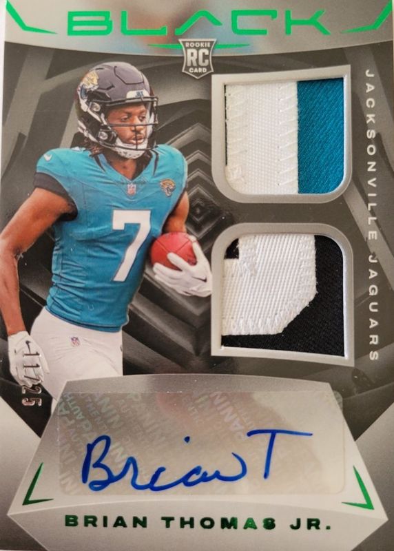 The Brian Thomas Jr. 2024 Black #207 Rookie Patch Auto - Emerald /25 card in Raw condition has not changed in price in the last 30 days and was last sold for $100.00 .