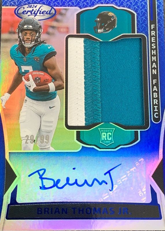 The Brian Thomas Jr. 2024 Certified #FMS-BTJ Freshman Fabric Signatures - Mirror Blue /99 Rookie card in Raw condition has not changed in price in the last 30 days and was last sold for $21.02 .