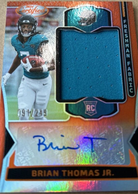 The Brian Thomas Jr. 2024 Certified #FMS-BTJ Freshman Fabric Signatures - Mirror Orange /249 Rookie card in Raw condition has not changed in price in the last 30 days and was last sold for $50.00 .