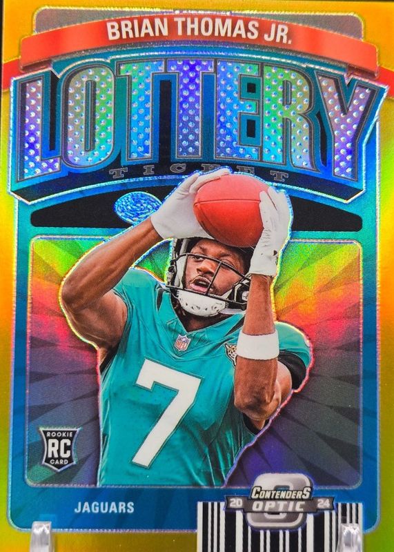 The Brian Thomas Jr. 2024 Contenders Optic #LT-BTJ Lottery Ticket - Gold /10 Rookie card in Raw condition has not changed in price in the last 30 days and was last sold for $164.11 .