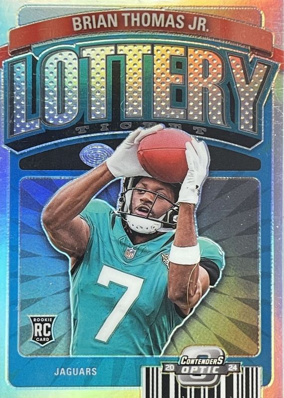 The Brian Thomas Jr. 2024 Contenders Optic #LT-BTJ Lottery Ticket /(SSP) Rookie card in Raw condition has not changed in price in the last 30 days and was last sold for $11.01 .