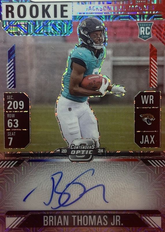 The Brian Thomas Jr. 2024 Contenders Optic #103 Rookie Ticket Auto - Red White Blue /13 card in Raw condition has not changed in price in the last 30 days and was last sold for $137.50 .