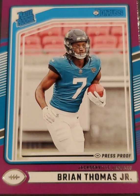 The Brian Thomas Jr. 2024 Donruss #313 Press Proof Purple Rookie card in Raw condition has not changed in price in the last 30 days and was last sold for $1.95 .