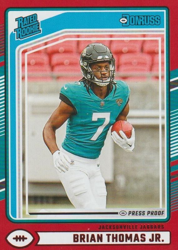 The Brian Thomas Jr. 2024 Donruss #313 Press Proof Red Rookie card in Raw condition has moved up $0.60 (+60.6%) in the last 30 days and was last sold for $1.59 .