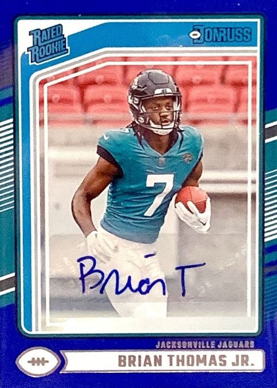 The Brian Thomas Jr. 2024 Donruss #313 Rated Rookie Autographs - Blue card in Raw condition has not changed in price in the last 30 days and was last sold for $10.00 .