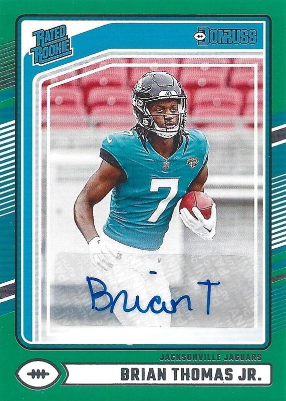 The Brian Thomas Jr. 2024 Donruss #313 Rated Rookie Autographs - Green card in Raw condition has moved up $45.49 (+314%) in the last 30 days and was last sold for $59.99 .