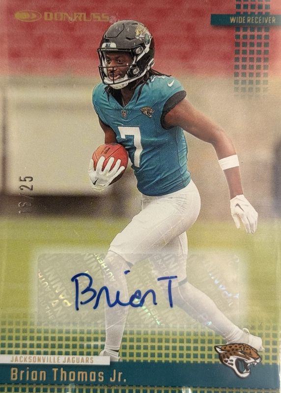 The Brian Thomas Jr. 2024 Donruss #31 Retro 2004 Autographs /25 Rookie card in Raw condition has not changed in price in the last 30 days and was last sold for $71.00 .