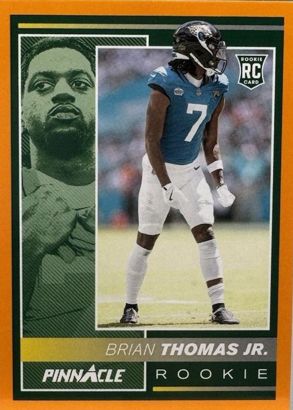 The Brian Thomas Jr. 2024 Encore #213 Orange /99 Rookie card in Raw condition has not changed in price in the last 30 days and was last sold for $6.50 .