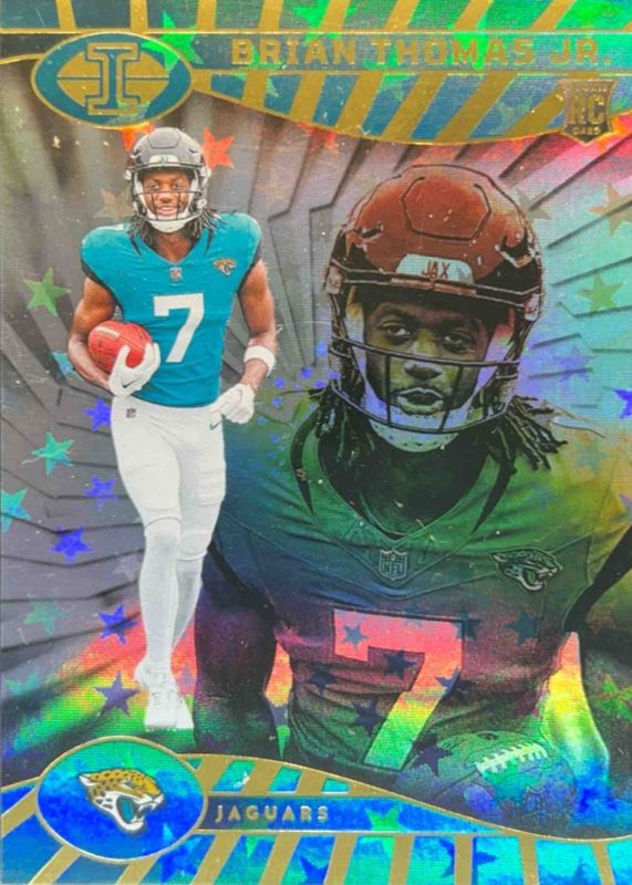 The Brian Thomas Jr. 2024 Illusions #41 Trophy Collection Galactic Rookie card in Raw condition has not changed in price in the last 30 days and was last sold for $6.50 .