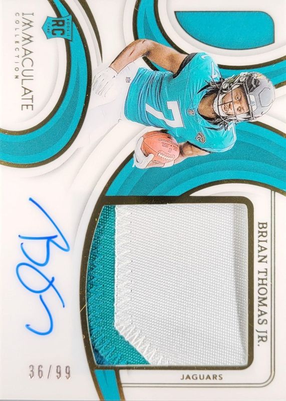 The Brian Thomas Jr. 2024 Immaculate #PPRA-BTJ Premium Patch Rookie Autographs /99 card in Raw condition has moved up $7.00 (+8.9%) in the last 30 days and was last sold for $86.00 .
