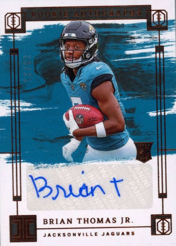 The Brian Thomas Jr. 2024 Impeccable #RA-BTJ Rookie Autographs - Bronze /35 card in Raw condition has not changed in price in the last 30 days and was last sold for $62.31 .