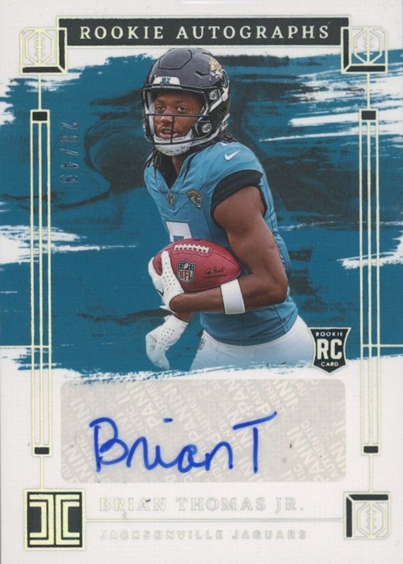 The Brian Thomas Jr. 2024 Impeccable #RA-BTJ Rookie Autographs - Silver /49 card in Raw condition has not changed in price in the last 30 days and was last sold for $36.00 .