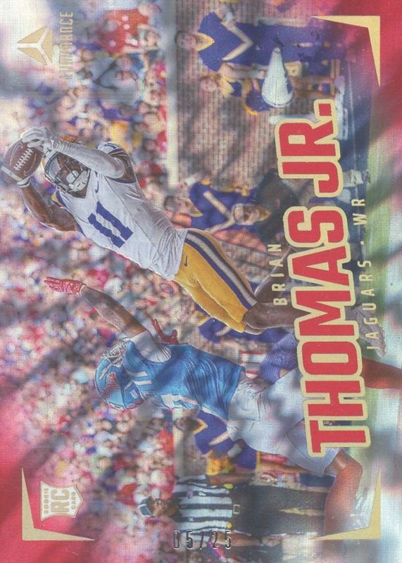 The Brian Thomas Jr. 2024 Luminance #184 Horizontal Rookies - Red /25 card in Raw condition has not changed in price in the last 30 days and was last sold for $2.25 .