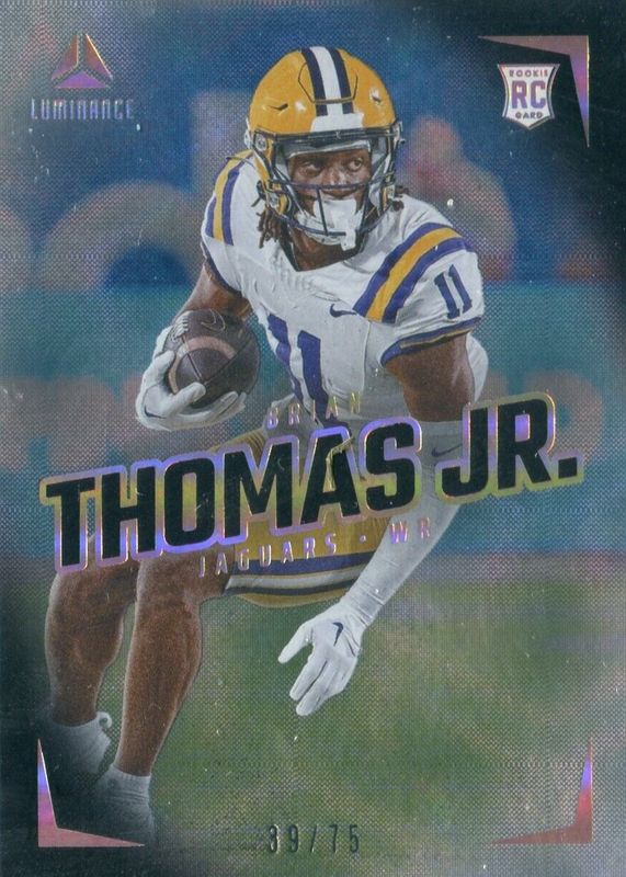 This card is 1 of 26 Brian Thomas Jr.'s card variations in the 2024 Luminance set being tracked by Sports Card Investor, including Horizontal Rookies, Vertical Rookies, Horizontal Rookies - Gold /299, Vertical Rookies - Gold /299, and Horizontal Rookies - Purple /175.