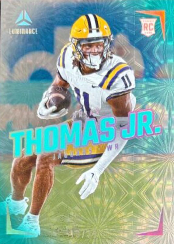 This card is 1 of 26 Brian Thomas Jr.'s card variations in the 2024 Luminance set being tracked by Sports Card Investor, including Horizontal Rookies, Vertical Rookies, Horizontal Rookies - Gold /299, Vertical Rookies - Gold /299, and Horizontal Rookies - Purple /175.