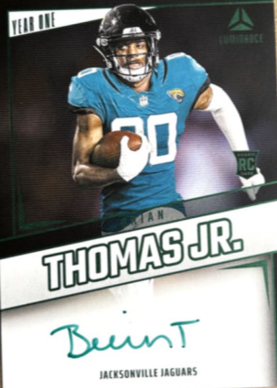 The Brian Thomas Jr. 2024 Luminance #YOS-BTJ Year One Signatures - Green Rookie card in Raw condition has not changed in price in the last 30 days and was last sold for $24.39 .