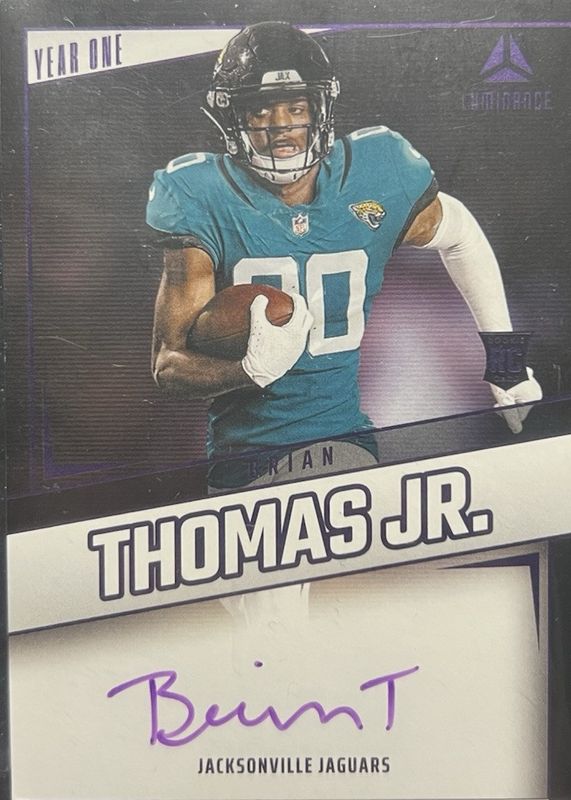 The Brian Thomas Jr. 2024 Luminance #YOS-BTJ Year One Signatures - Purple Rookie card in Raw condition has not changed in price in the last 30 days and was last sold for $55.00 .