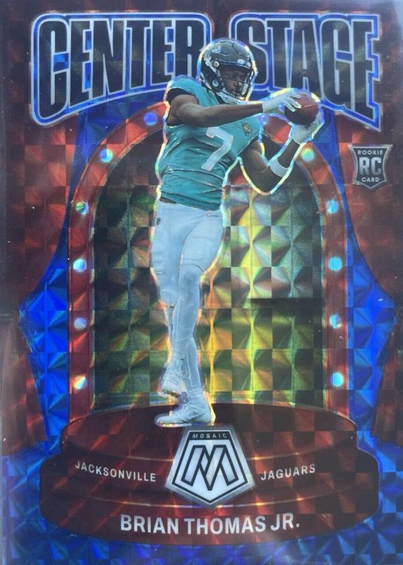 The Brian Thomas Jr. 2024 Mosaic #4 Center Stage - Blue /99 Rookie card in Raw condition has not changed in price in the last 30 days and was last sold for $10.00 .