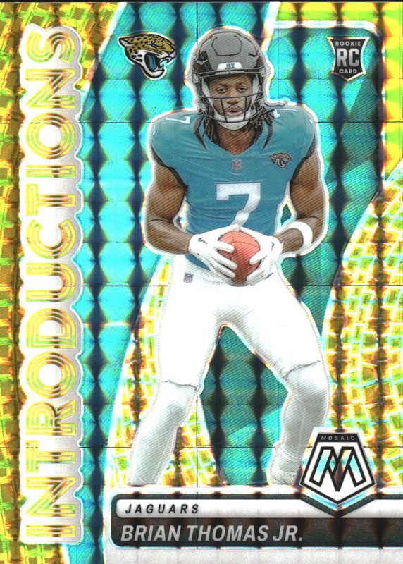 The Brian Thomas Jr. 2024 Mosaic #7 Introductions - Gold /10 Rookie card in Raw condition has not changed in price in the last 30 days and was last sold for $100.00 .