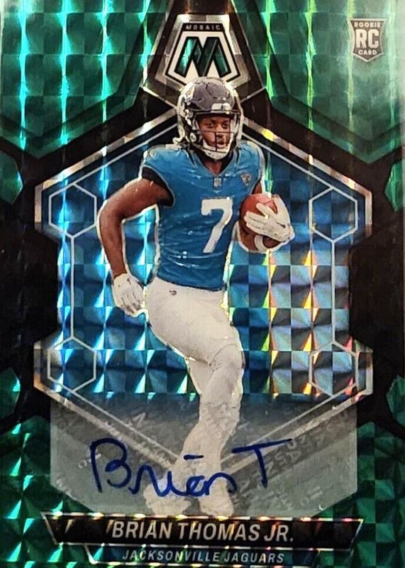 The Brian Thomas Jr. 2024 Mosaic #323 Rookie Autographs - Choice Fusion Green & Black /25 card in Raw condition has not changed in price in the last 30 days and was last sold for $150.00 .