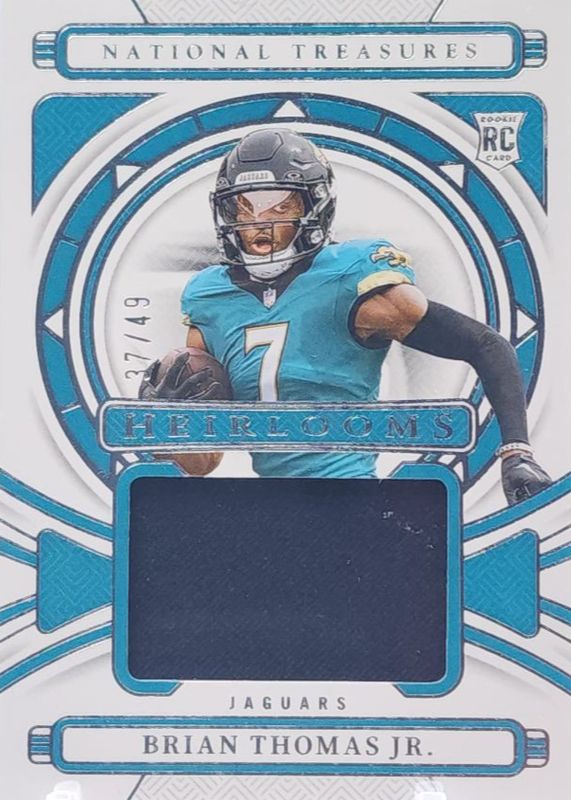The Brian Thomas Jr. 2024 National Treasures #H-BTJ Heirlooms /49 Rookie card in Raw condition has moved up $1.50 (+14.3%) in the last 30 days and was last sold for $12.00 .