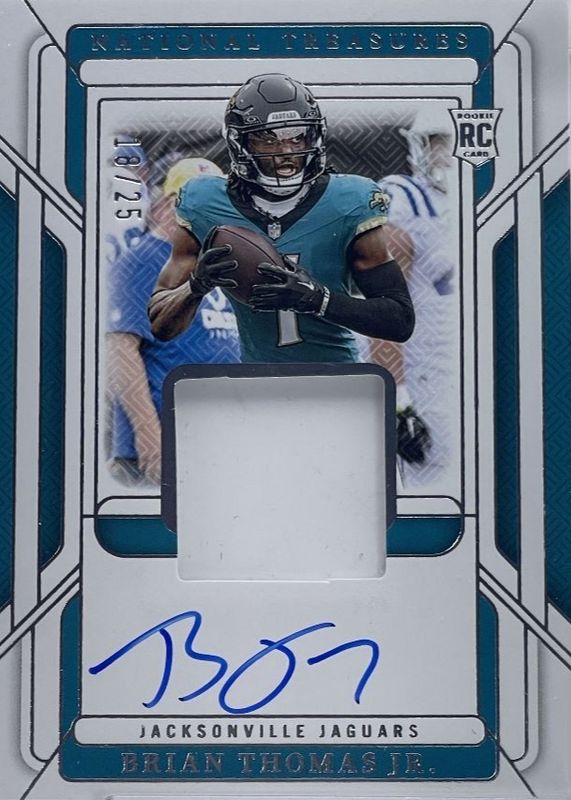 The Brian Thomas Jr. 2024 National Treasures #RGS-BTJ Rookie Gloves Signatures /25 card in Raw condition has not changed in price in the last 30 days and was last sold for $91.00 .