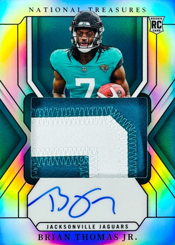 This card is 1 of 104 Brian Thomas Jr.'s card variations in the 2024 National Treasures set being tracked by Sports Card Investor, including Rookie Dual Materials - Red Jersey Number (/7), Rookie Material Signatures - Green Jersey Number (/7), Rookie Patch Auto - Green Jersey Number (/7), Century Materials /99, and Crossover Rookie Patch Autographs /99.