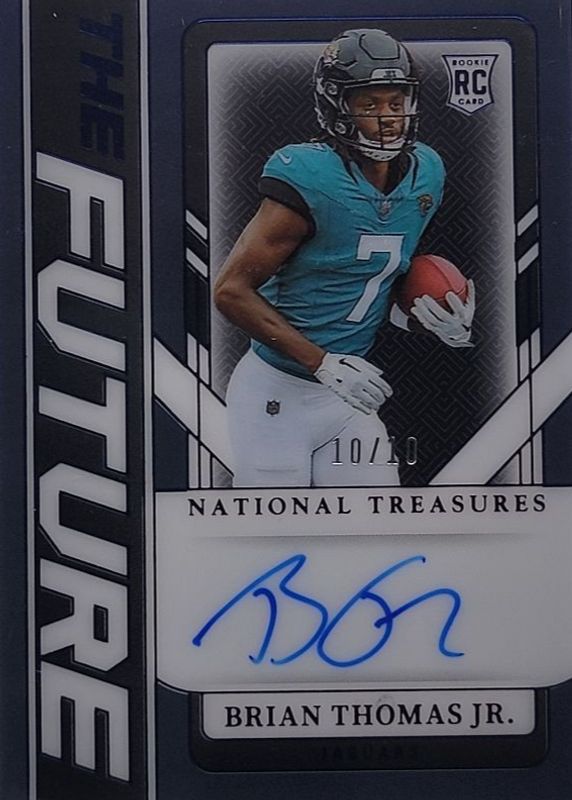The Brian Thomas Jr. 2024 National Treasures #TF-BTJ The Future Autographs - Blue /10 Rookie card in Raw condition has not changed in price in the last 30 days and was last sold for $217.50 .