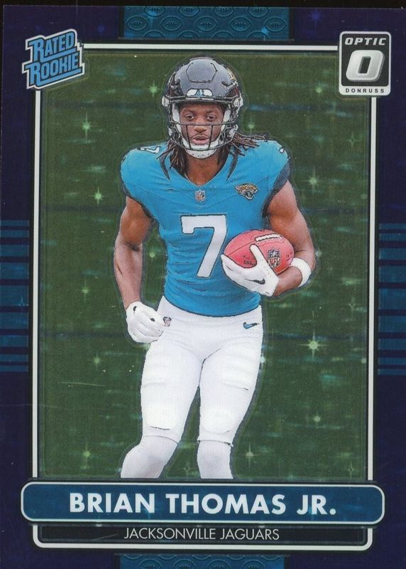 The Brian Thomas Jr. 2024 Optic #12 2014 Retro Series - Purple Stars /25 Rookie card in Raw condition has not changed in price in the last 30 days and was last sold for $90.00 .